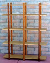Finally upgrading some home furnishings, a bookshelf being the newest. This one is 59"h x 45"w x 12.75" deep. The 6 post uprights were made from 4/4 stock ripped and laminated to create bookmatched patterns. Beveled on 4 corners by 30% they are octagonal measuring 1.5" x 2" and stand a bit proud from the notched shelves. Nylon pads are recessed into the bottom of each.