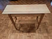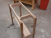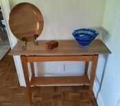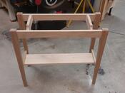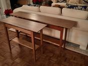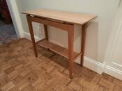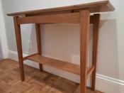 This table was built to match a larger version I made a few years ago. All pieces, except the legs, are downsized. Construction is entirely mortise and tenon. Legs are tapered, the rails and top supports have slight curves on the bottom edges. The top, 12x36, is wormy Chestnut, stained a light weathered gray.