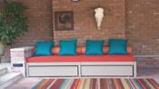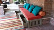 This bench was built for seating, napping and storing pool toys. The wood is Lyptus. Bench is 25" x 100" with mortise and tenon joinery. A plywood deck supports the cushion. Large drawers are on wheels to be easy for children to move.