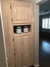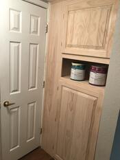 After demo’ing an old stack washer/dryer, we converted the space into a storage area for vacuum cleaners and misc items. We raised the panels for the doors, and extended the left side a bit to conceal the existing 220 outlet and water/drain points of connection.
