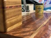 I needed a place to put pens on my desk and my co-worker, Lyle, had made one very similar to this one. I went ahead and tried to replicate his, but using Bubinga and Afromosia instead. I cut the strips to my desired thickness and glued up the main panel. I re-sawed the remaining 4/4 Afromosia I had to 1/4" pieces and glued in accent strips of Bubinga, so the box and base were opposites. I cut the long piece of Afromosia into four separate parts and just simply glued them together with an overlapping joint. Before gluing the box to the baes, I took it to the spindle sander and created a faux-live edge. I then sprayed water to raise the grain on both the box and the base and started sanding at 80 grit and progressed to 120, 150, 180, 240, 320, 400, 500, 600 and finally 800 grit. I sanded so high because I wanted the glossy sheen from the natural wood to pair with the matte finish of the Odie's Oil. The result was a mirror like finish in which you could see the reflection of the Odie's Oil jar. It now sits at my desk and performs its function perfectly for my needs.