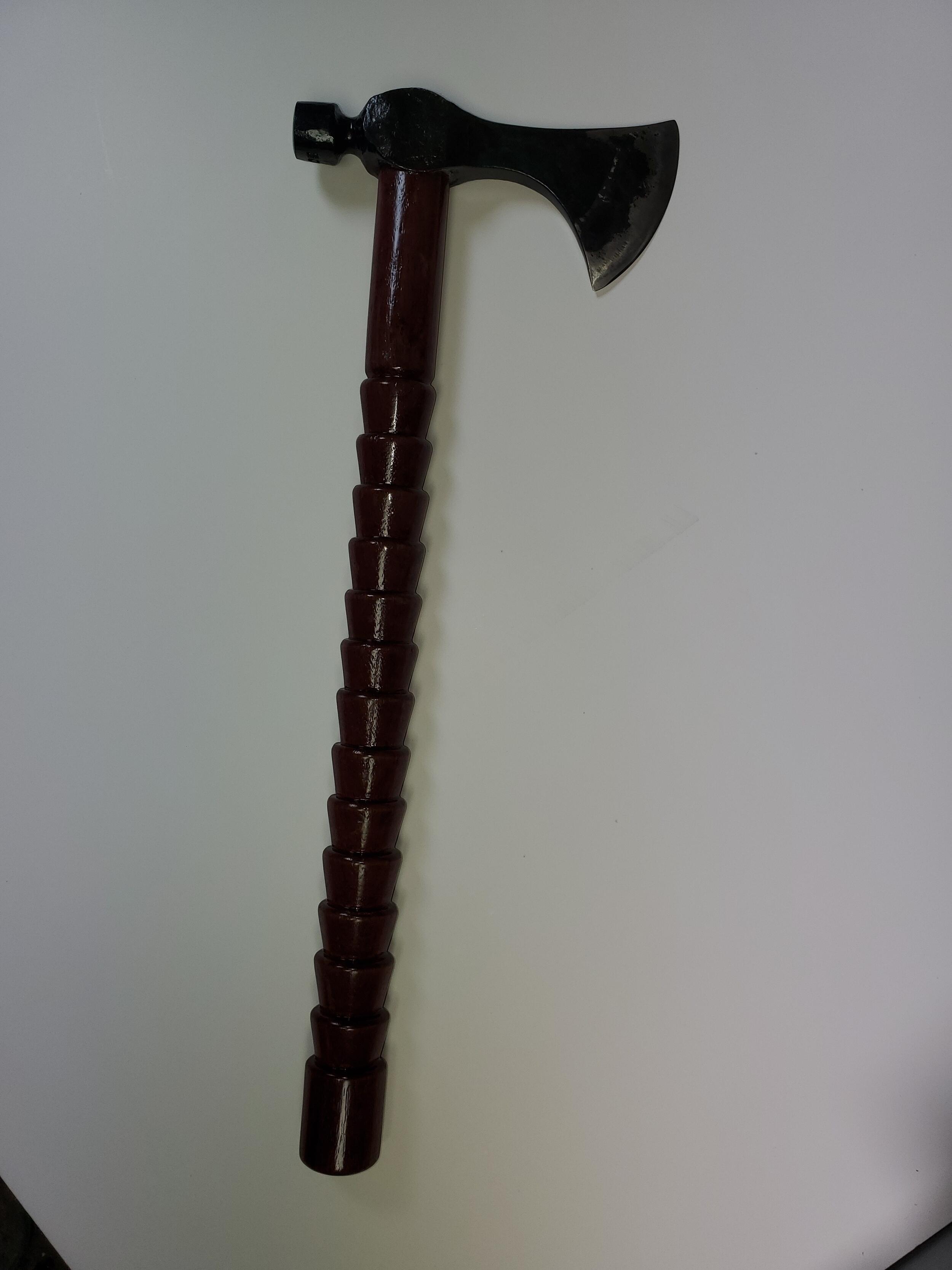 Handle is turned, then cut in half at the table saw. Run across the jointer to size to get that oval shape, then glued together. Wooden wedge at the top, epoxied in.