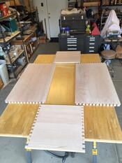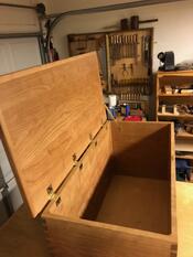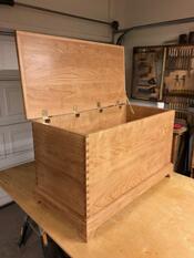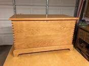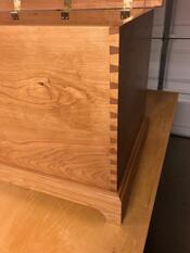 A hope chest for friend's granddaughter. Tried for a classic design but used baltic birch plywood for floor and top (with cherry laminated on both sides). Woodworkers source had some absolutely great cherry - long clear wide board. ALL dovetails were hand cut. Basic box was 20" Deep, 20" High, and 40" wide.