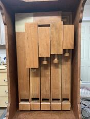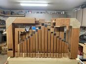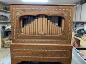This is a 42 note MIDI operated street organ. It will be hand cranked to supply the air and play tunes from an SD card. I designed and built the pipes. And chest. The 5 lowest bass pipes are under the chest, with the remaining 37 on top. The case was purchased from a fellow builder