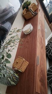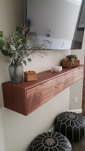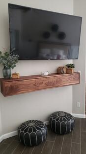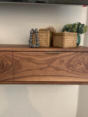 Floating media console custom made for a client using walnut wood with waterfall features. The front face is made of high character walnut and has three separate storage areas within that open downward. French cleat used as a mounting system. Finished with Rubio Monocoat Oil Plus 2C Pure.
