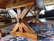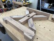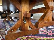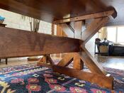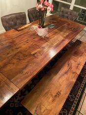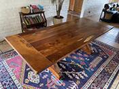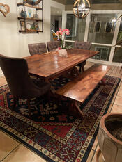 I built this dining table out of solid Mesquite. Used epoxy with turquoise stone to fill the voids. All mortise and tenon joinery. Breadboard ends. Top is held to the base via dowels. Tusked mortise and tenons to hold the runner to the 2 base pieces. A huge project that took about 6 months from start to finish but well worth it. Hope you like it!
