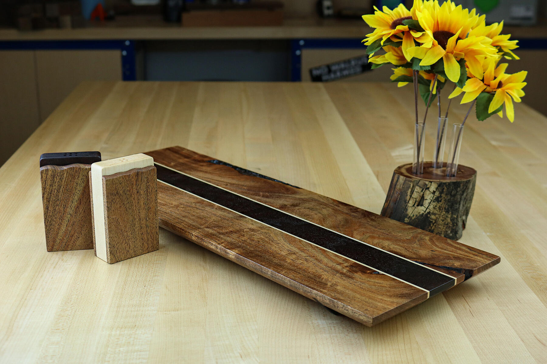 He gave the salt and pepper shakers some sculpted accent along the top edges, and angled the feet of the tray for a unique look.