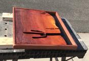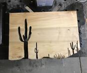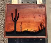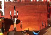 This piece is the first of my custom desert, saguaro cutout wall art projects. It features a single maple board and walnut frame, affixed to a plywood backer I sprayed black to form the silhouette. I hand mixed the stains from General Finishes red, yellow, and blue colors.