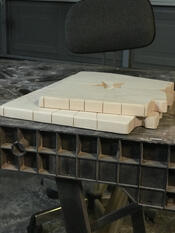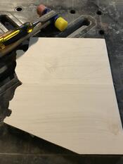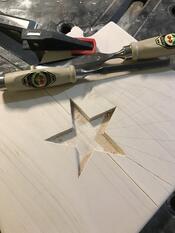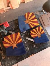 These Arizona plaques are all from maple glue ups. I covertly transformed the seam into the partition between the rays and the blue sections. Some chisel work, some bandsawing, some sanding, some staining, and voila! Pieces that look great on the wall. The star is epoxy mixed with sawdust from paduak along with red and gold mica powders.