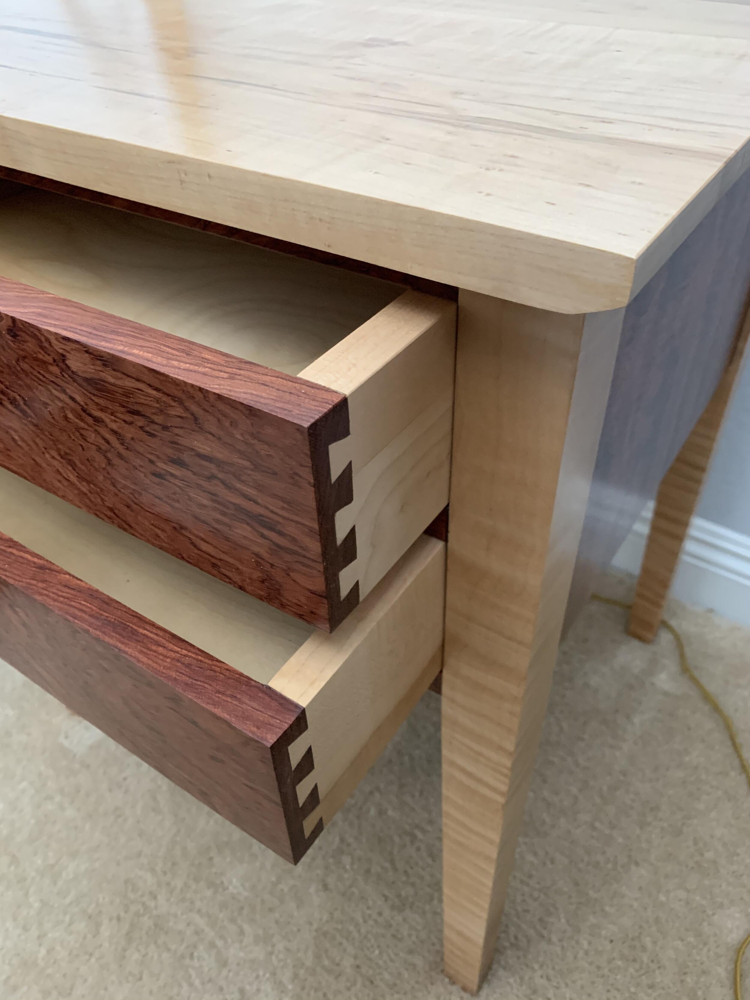 Two matching nightstands with book matched drawer fronts. I titled the stands “Contrast I & II”because of the similar but different woods. I used curly maple legs, one birdseye and one spalted maple top, waterfall bubinga veneer sides, book matched figured bubinga drawer fronts. I also used maple and bubinga scraps to build the drawer sides and slides.