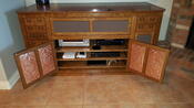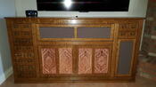 I made this to hide all the components and wires going to the TV. We have several antiques so decided to make it all with solid quarter sawn white oak, except for the shelves inside. They are made with oak plywood. I wanted to make sure everything inside ran cool so the sides and front have speaker cloth for both the speakers and for cooling. The doors in the front have copper plates I punched out for decoration and more cooling. The back is open also for cooling. Took that idea from the antique pie safes. The idea for the drawers in front are from an antique Library Card Catalog Cabinet.