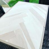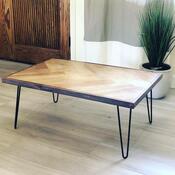Created a herringbone pattern on plywood . Glued the panels, I used wood filler to clean the seams and finished with a walnut frame. First time trying this pattern so I did not want to use very expensive wood for the top. Still looks beautiful after staining and finishing. Hairpin legs to add a mod touch!