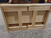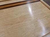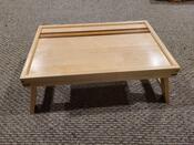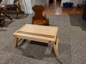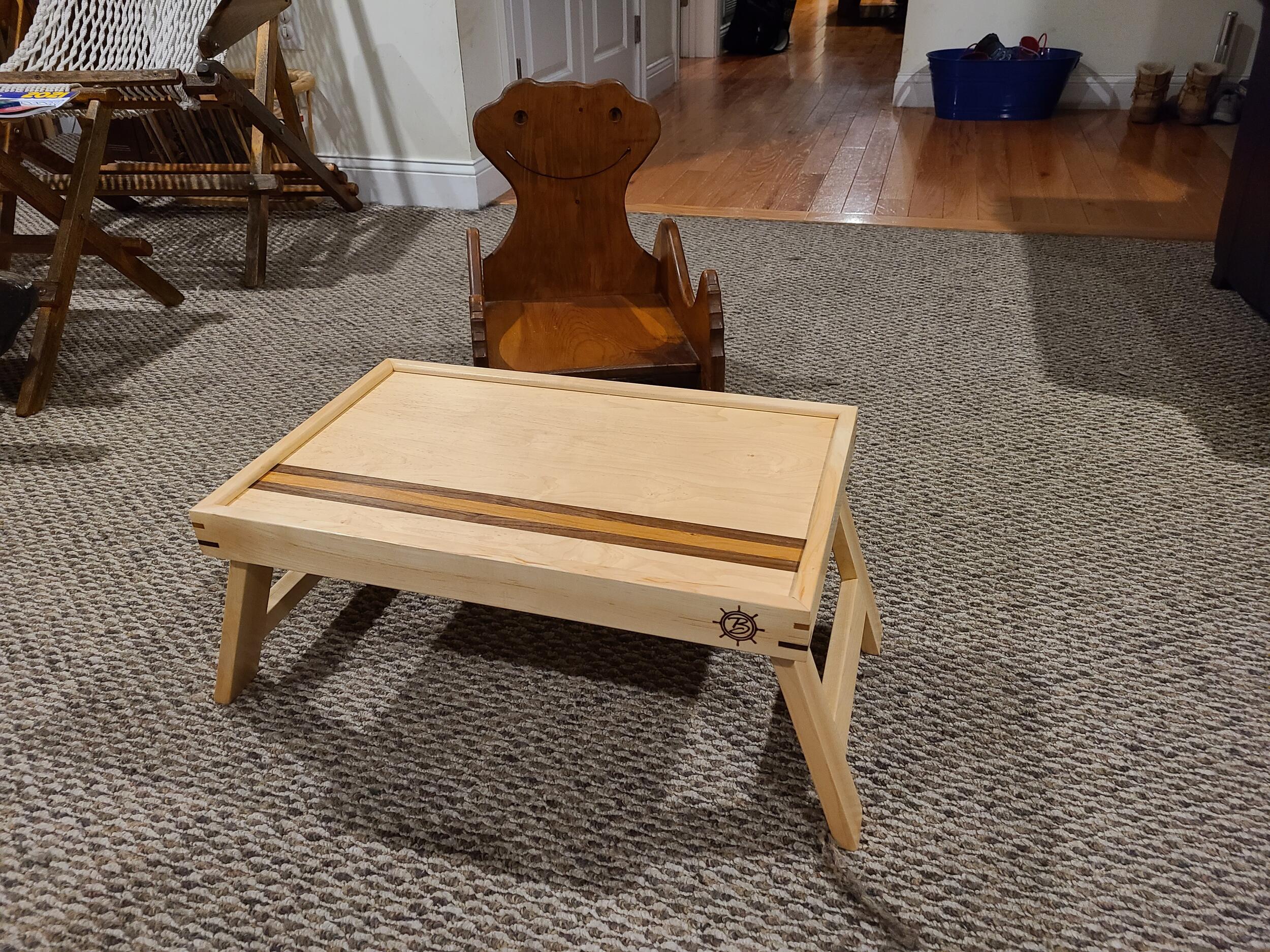 Made a small lap desk or child's TV tray. I used solid Bird's Eye Maple for the tray surface and mitered maple boarders/legs. The legs fold and are held closed with magnets. The splines are cherry and walnut to match the stripes in the table.