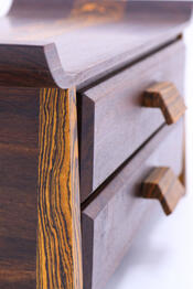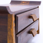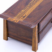 Theron really knocked out a gorgeous specimen of craftsmanship with this box. Numerous details like the beveled drawer fronts and tapered corners make this project stand out in a crowd. His choice of woods give it a one-of-a-kind appearnce as well.