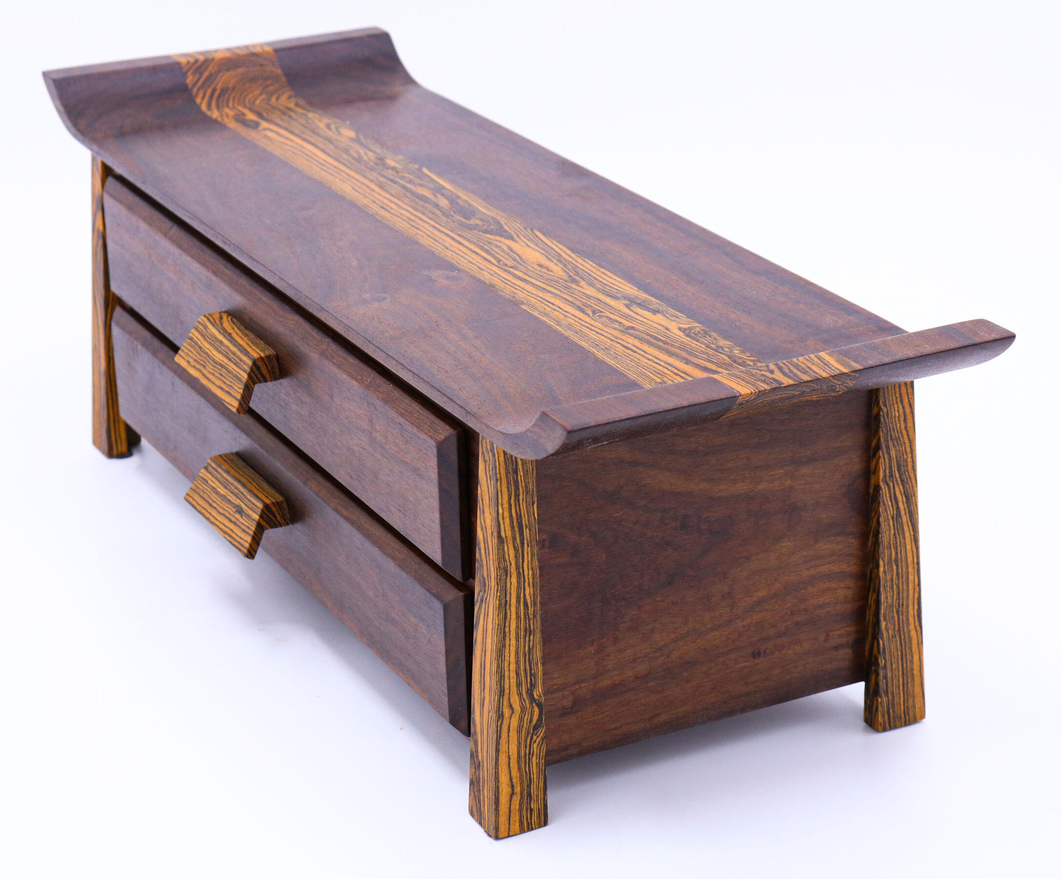 Theron really knocked out a gorgeous specimen of craftsmanship with this box. Numerous details like the beveled drawer fronts and tapered corners make this project stand out in a crowd. His choice of woods give it a one-of-a-kind appearnce as well.