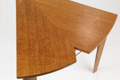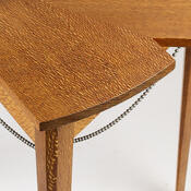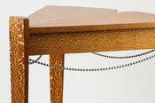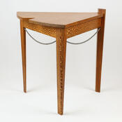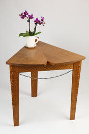 Here's a delightful little table by Warren Fenzi that's a work of wonder between its "pie slice" shape, faceted legs, numerous angles, decorative bead strings, and - of course - his choice in dazzling wood!