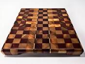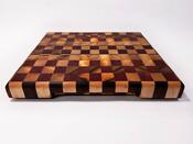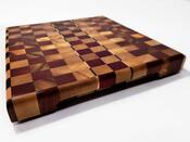 This end-grain butcher block cutting board is made from purpleheart and myrtle with trimming and striping made from black walnut and maple. Finished with food-grade mineral oil, citrus oil and beeswax. Includes 1" non-slip feet and sizable, comfortable beveled handles underneath.