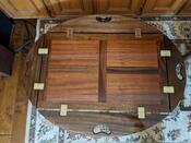 This butler tray table was taken from an old Ethan Allen catalog with dimensions and pictures from 1974. It is 100% sapele other than (the brass hinges and screws). To accentuate the contrast between pieces, the 4 center rectangles were stained with a red mahogany stain, the borders with a darker walnut stain. The center table pieces are assembled with glue joints since the pieces interlock and the tops are different sizes from the bottoms. That was a bit tricky. The hard part is always the finishing, not just the hinges! Other than the areas directly under the center of the table, all surfaces had to be finished smoothly and flawlessly. When working on one side, its underneath would be touching its supports and be subjected to drips, marks, etc. Eventually, I got it. I made 2 of these.