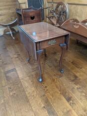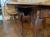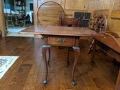 The drawing and instructions for this table came from a reproducing antique furniture book. I pretty much followed all of the steps in construction, but I found a serious error in the rule joints. Those are the moldings where the leaves connect to the main table. The instructions called for the drop-leaf hinges to be flush. That changes the axis of rotation to be inside the table and not under it, which means that if the leaves are flush with the table when open, they will hit the edges when closed unless there is a 1/16" inch gap between the table and the leaves when the leaves are open. Moving the hinge made no difference, it was the fact that they were inserted, kind of like the hinges of the butler tray table (the leaves and table must be separated there as well or they'll hit). The cabriole legs are glued up in sections, then shaped with belt and rotary sanders. There is a picture of the leaf support. The wooden hinge for that has a 3/16" brass pin. The hinge has scooped out hand grips so that they're easy to swing open. Other than that, the drawer pull and the screws for the cleats in the top, there are no other hardware used. Final assembly is when the table top and leaves are quite cured because it is assembled upside down onto the frame and hinges while sitting on a Styrofoam sheet.