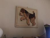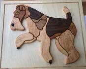 I found a picture of my first dog Domino and had some leftover wood in the box. I decided to build a memorial for him. I enlarged the photo to almost the original size of the dog. Cut the print into pieces according to the color (wished I had found a wood whiter than Maple) because what looks like ivory, supposed to be white. Transferred the pieces to the wood, cut, sanded, scraped to make the pieces fit as well as possible. I used a round-over bit to soften the edges. Sanded the face of the wood to 180 grid, glued all together. I cut out inlays for eye and nose and glued glass halves in. Waited a day and sanded to final 240 grid, oiled and waxed. I cut a piece of 3/4" plywood to size 20 x 24", routed a 1/4" groove around, and fastened the dog figure to it with two screws. Picture hooks and wire finished the project and my first dog Domino hangs now over my desk and reminds me of the fun we had together.