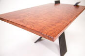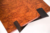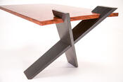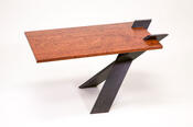 He chose a gorgeous slice of a giant one-piece bubinga slab and a couple chunks of 3/4" plywood to fashion a pair of legs and just trimmed the slab until all things gravity married the weight of the wood and the point of contact into a handsome balancing act of woodworking acrobatics.