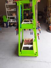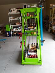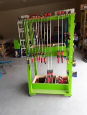 The clamp rack was made entirely from scrap wood. The uprights were cut from 2 warped 2x6s with a 5 degree bevel at the bottom to create the inward lean. The holders at the top for the clamps were cut from a 1 x 4 using my jig saw. The bars on the end provide easy access storage for my small hand clamps. The two boxes have dividers to separate the types of spring clamps and other small items. The top shelf is available for any seldom used items. The rack is on wheels for easy movement.