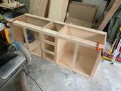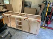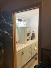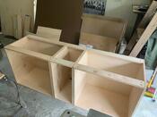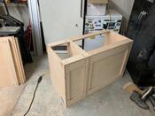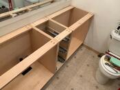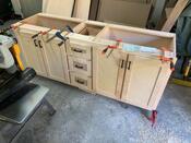 We decided to remodel our bathroom and the cabinets that were in there were that typical builder grade oak. The original cabinet carcasses were cheap big box store quality and I am surprised they lasted as long as they did. I built 4 cabinet carcasses. One for each sink and the center which is just for drawers. I figured it was easier to install three smaller carcasses than one bog one. The carcasses are made from 3/4" maple plywood. I believe the grade was B2. I had to take out a second mortgage. The sides of the carcasses have a 3/4" dado on the bottom edge that allows for a lap joint on the bottom piece concealing the raw plywood edge. This is unnecessary because this vanity goes wall to wall. The side pieces, bottom and top rear stretcher all have a 1/4" dado 3/4" from the rear edge allowing for a 1/4" piece of maple plywood to slide in. This also allows for a 3/4" backer to fit flush with the rest of the cabinet carcass. The backs all have backers to attach to a stud in the wall. The face frame is hard maple and is a shaker style and has mortise & tenon joinery. The doors have mortise and tenon joinery as well. The cabinet doors have a floating 1/4" maple panel and the drawers have a 1/2" maple plywood panel that has a 1/4" dado that allows the back side of the panel to be even with the back side of the drawer face frame. This allows for a strong connection to the drawer boxes. The drawers are 1/2" maple plywood and use box joints and a 1/4" maple plywood bottom. I used Blum undermount drawer slides. The top vanity was has crown molding decorative top. I had never cut crown before. I have a lot of respect for guys who do it for a living. The finish was my wife's decision. I wanted a had rubbed finish but we decided that since it is in a bathroom cabinet paint would probably be a more durable finish. I did the bulk of the work in 5 days.