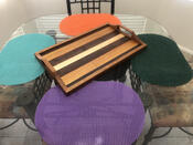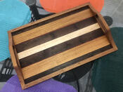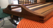 The frame is made of African mahogany, with African paduak splines in the mitered corners, to provide additional strength and a decorative touch. The hands were made with my CNC router. The bottom of the tray is approximately 3/8” thick and is made of walnut, African mahogany, African paduak, and maple.