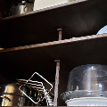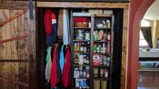 Opens to reveal double row coat racks and a shoe storage shelf on the left side and a hinged small can good storage swings open for large item storage on the right side. BBQ tools hang on side of canned item storage shelves.